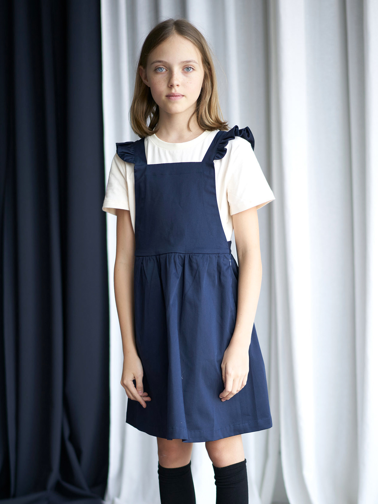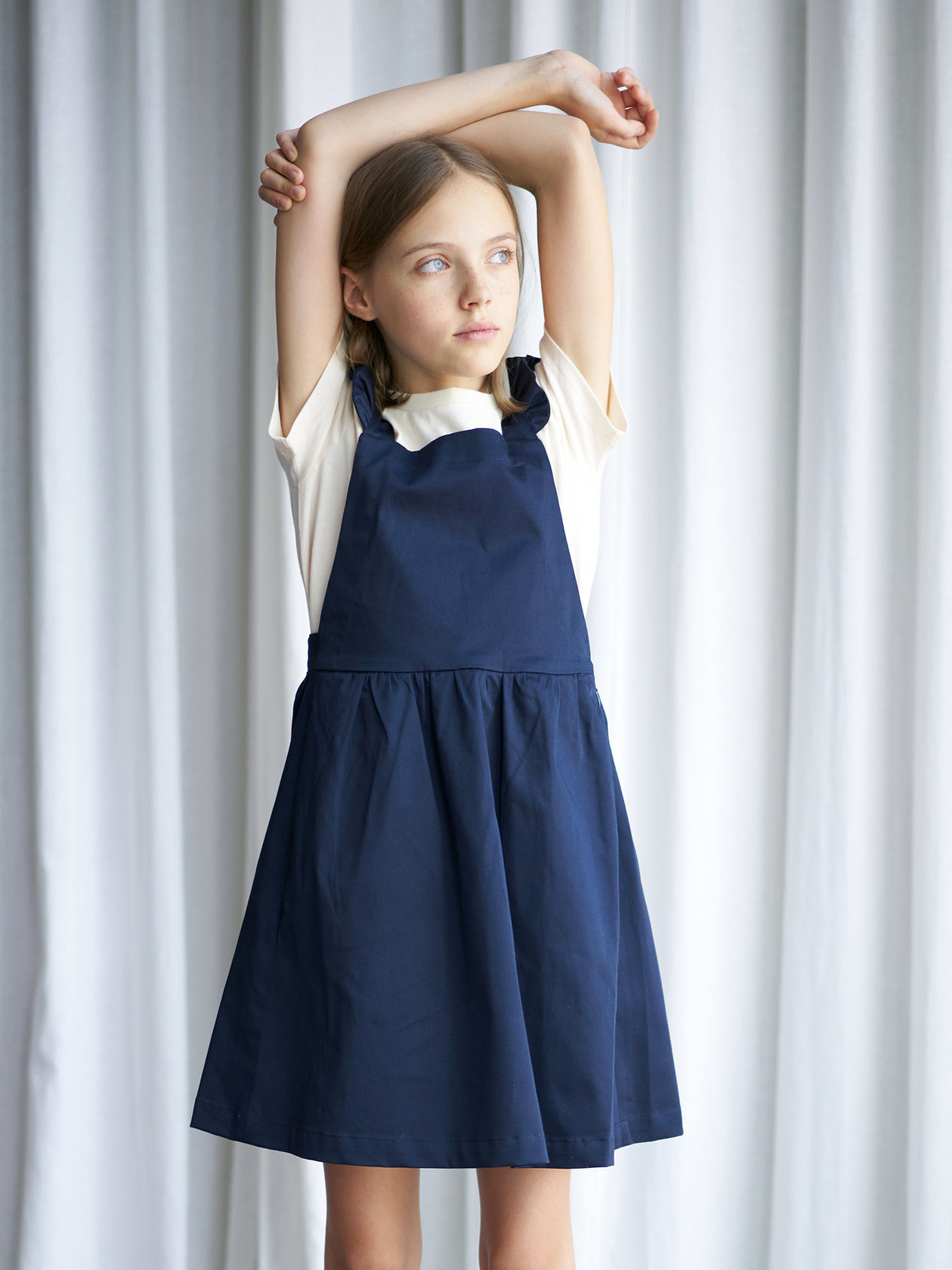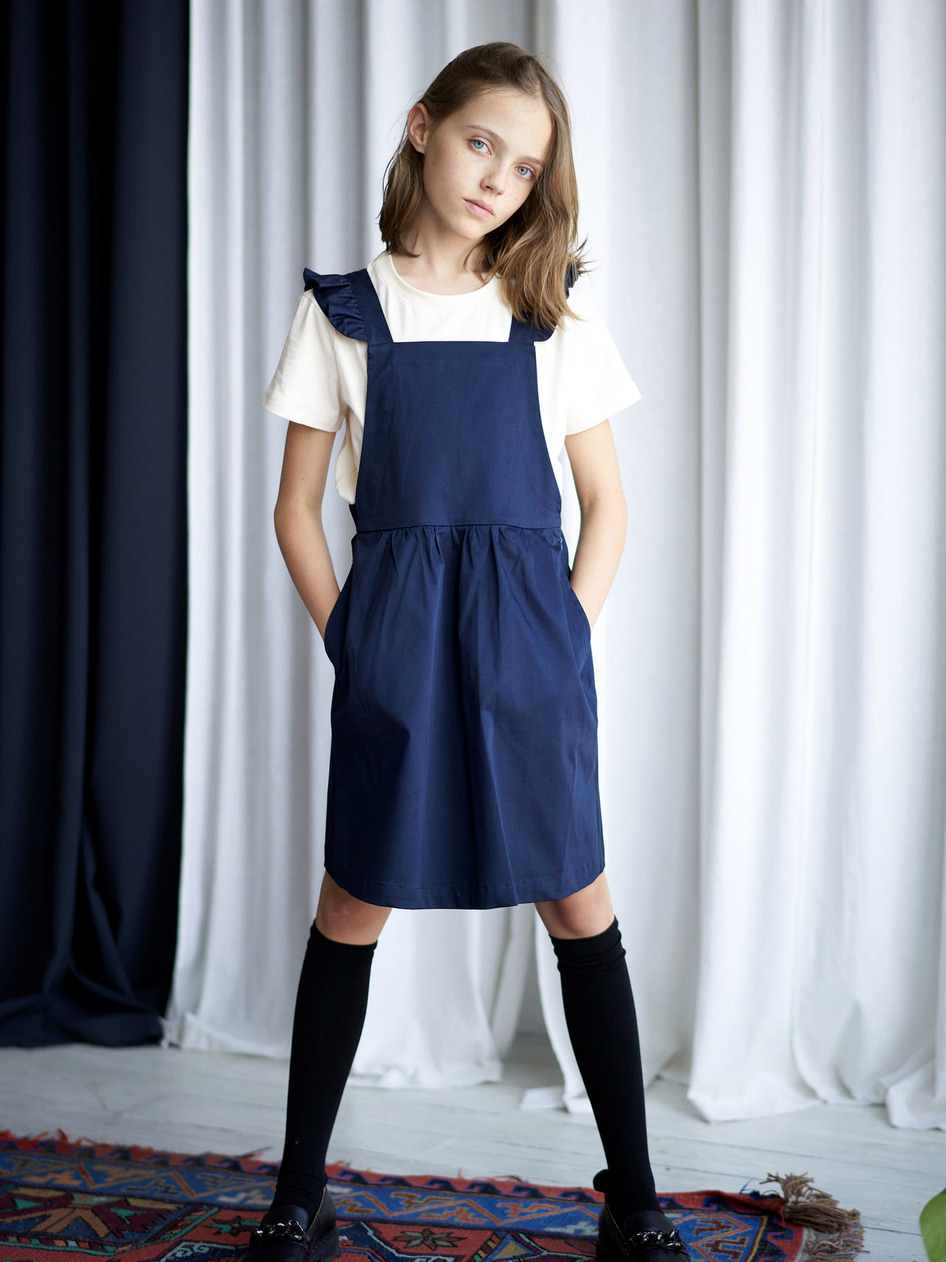 Сарафан из плотного гладкого хлопка с крылышками и удобными карманами и перекрещивающимися лямками. Из этого сарафана не так просто вырасти, потому что у него есть 2 варианта длины лямок. Отлично сочетается со свитшотами, водолазками и рубашками
