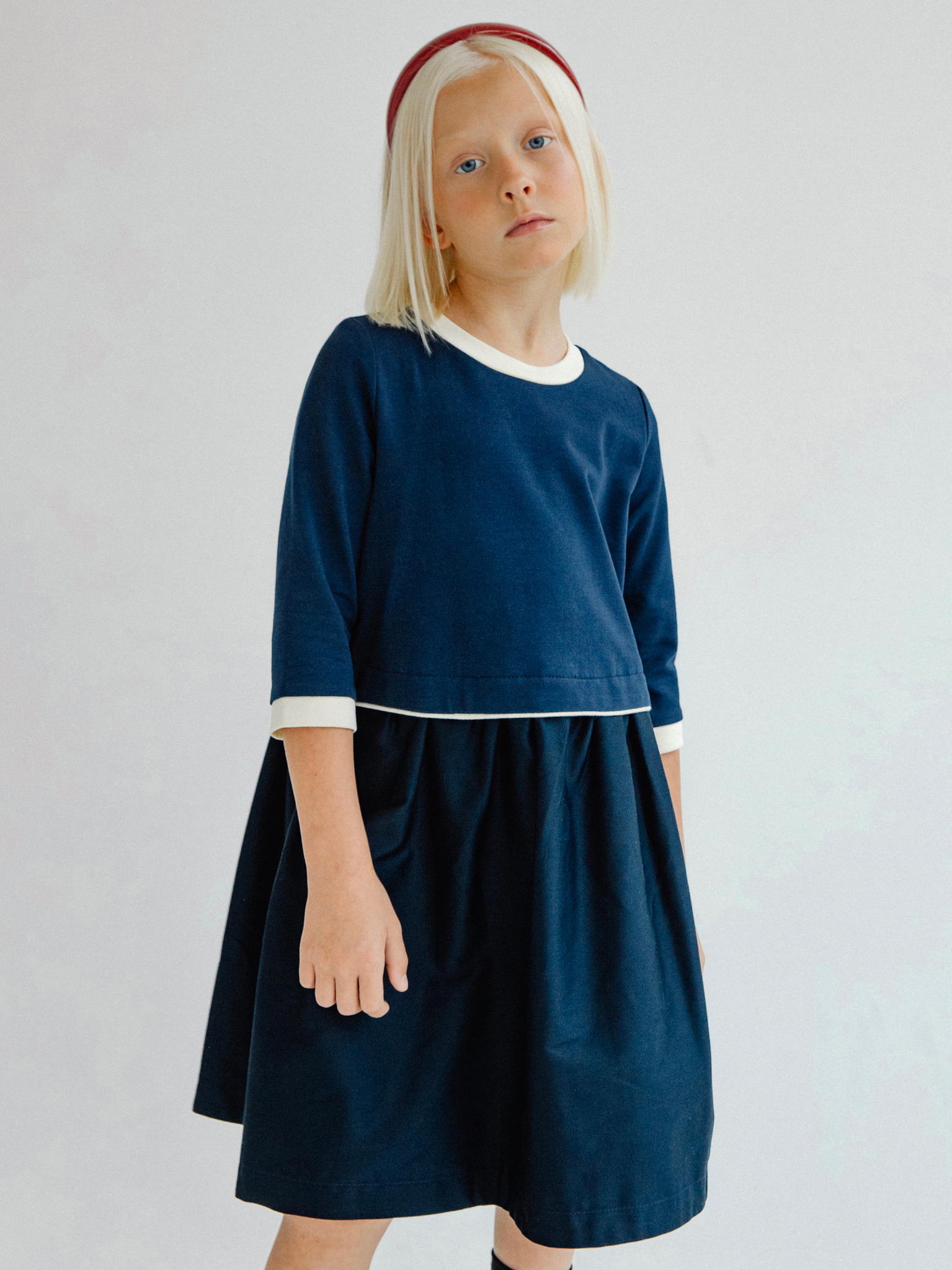Комбинированное платье синего цвета из двух видов хлопка. Верх выполнен из мягчайшей ткани френч-терри и отделан по низу кремовым кантом. Юбка с боковыми карманами выполнена из плотного гладкого хлопка.
