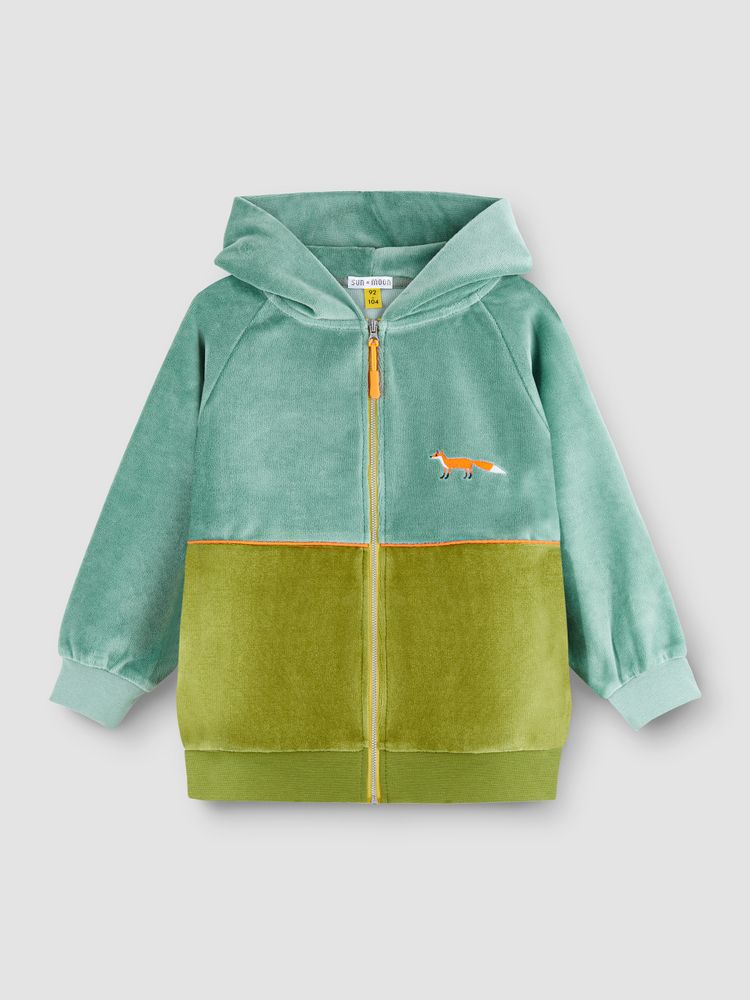 Худи на молнии из велюра двух цветов с кантом с карманами. На груди вышивка. Молния марки SAB.