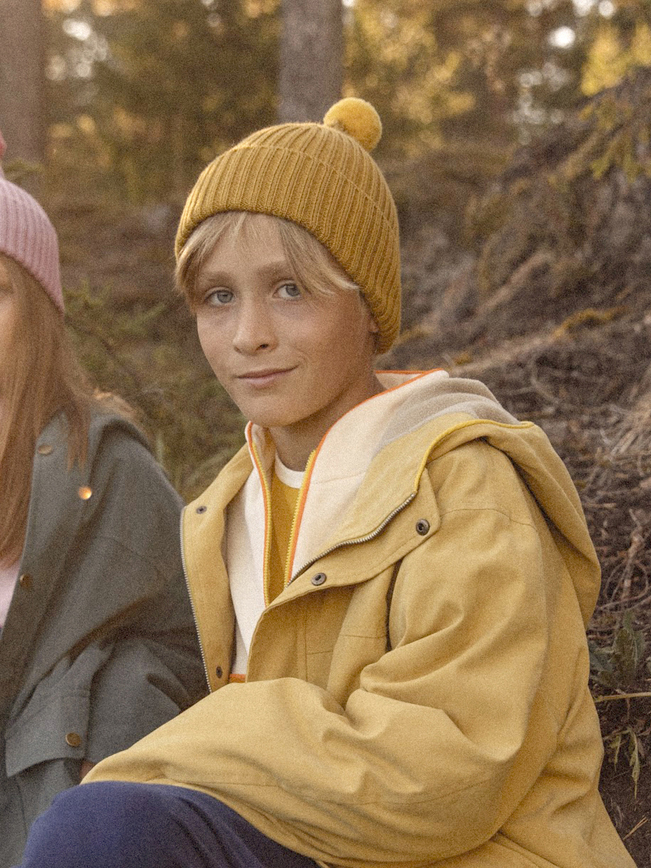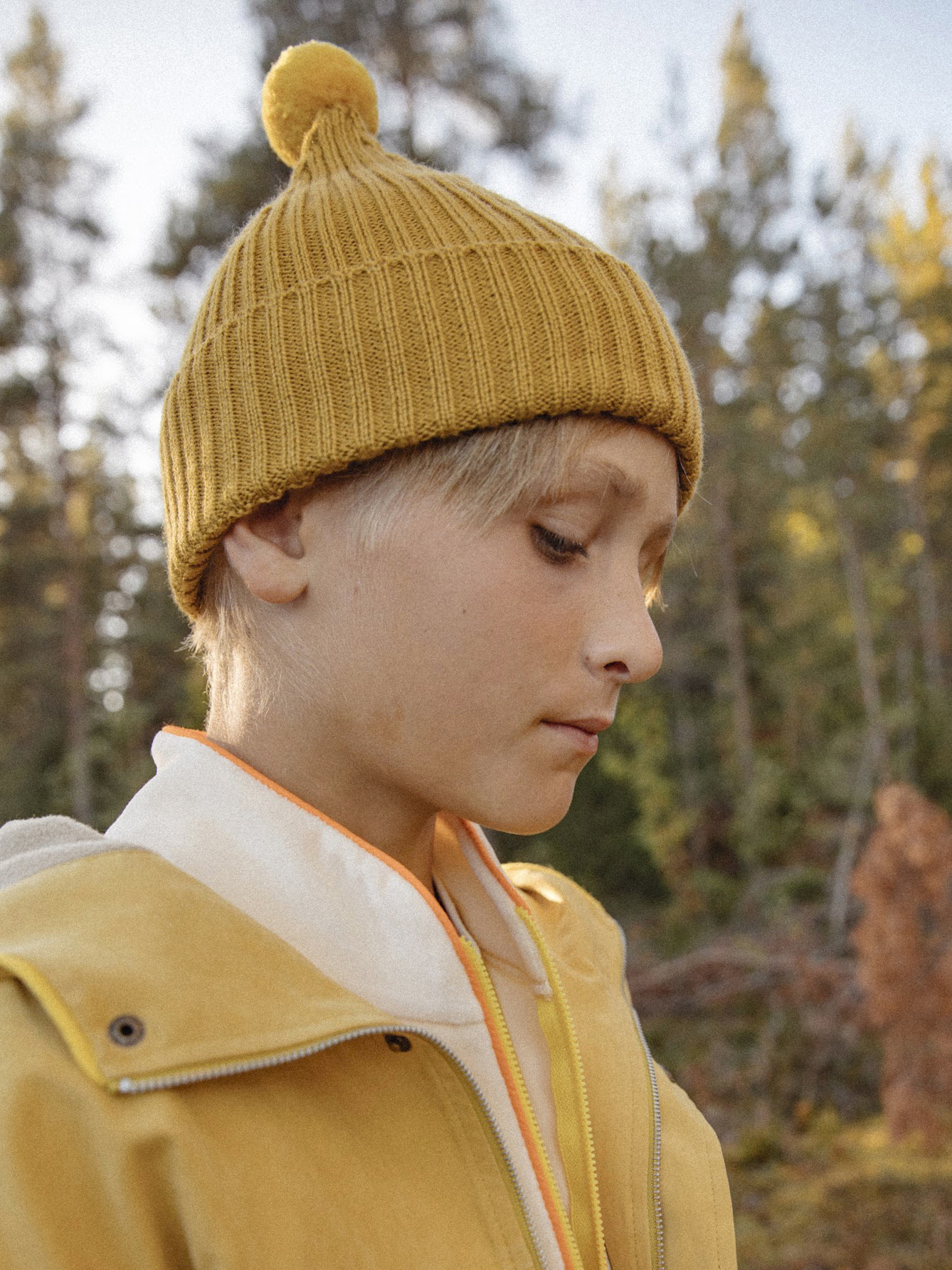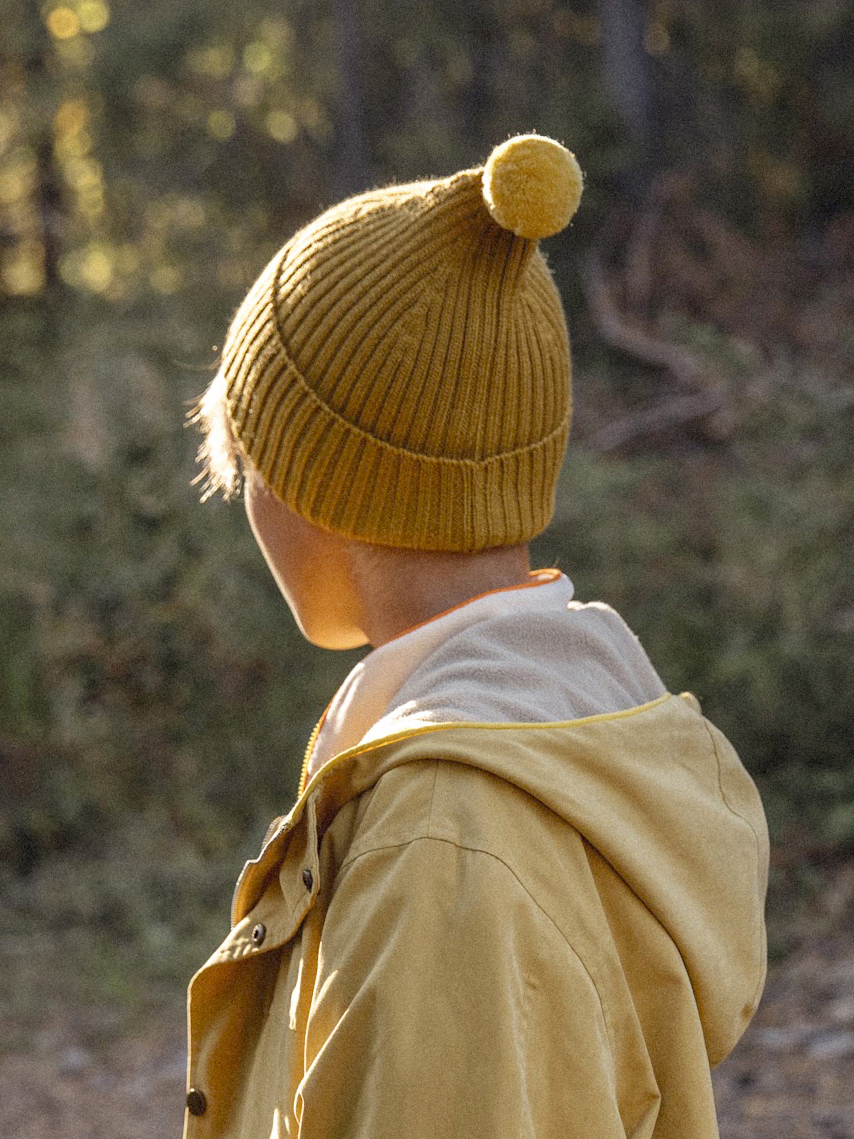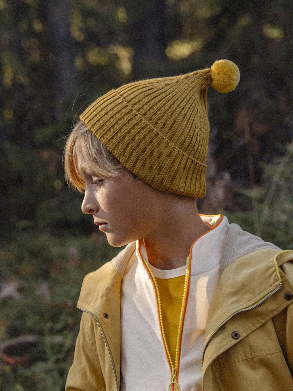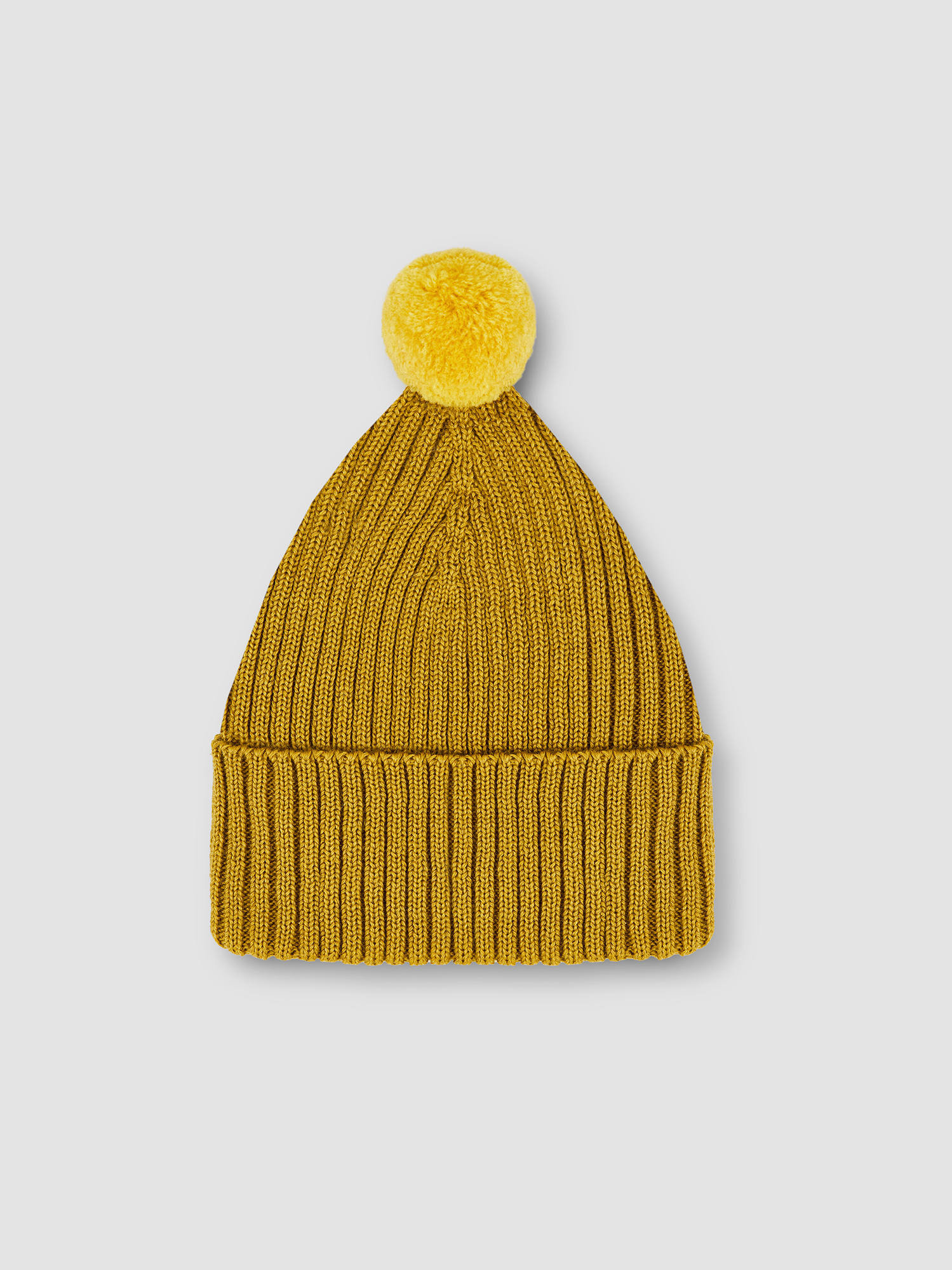 Шапка универсального размера с отворотом и ярким помпоном. Подходит детям всех возрастов.